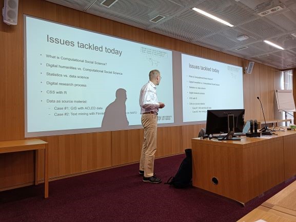 The second and third day of the workshop were organized at the University of Helsinki, Kaisa-library premises, and days’ agenda was focused on exploring new data analytical tools and methods for studying Russia and security related themes. First, Senior Research Fellow Kimmo Elo introduced computational social science research process and presented two research projects: basics of geospatial visualizations and analysis with R) and text mining of Finnish Parliament debates on NATO, 1950-2022. Second, professor Adam N. Stulberg presented the RuBase project that develops a new knowledge platform for scholars of International Relations and U.S./European-Eurasian relations. It is comprised of a comprehensive, Russia-specific corpora of material related to the country’s evolving discourse, strategies, policies, and international outcomes. It supports a set of tutorials related to computational approaches, methods and tools that can be accessed to query and extract empirically rich and analytically rigorous insight. Thirdly, Stephan de Spiegeleire (HCSS) explained the pros and cons of bibliometrics versus full text natural language processing (NLD/LLM). Specifically, the presentation addressed the question of whether LLM are in many ways much easier, accessible and powerful than more traditional NLP. Additionally, the use of LLM’s was showcased in the context of framing a research topic (example of taxonomy). During both days, students presented their research projects, followed-up by discussions on how to use new data-analysis themes.